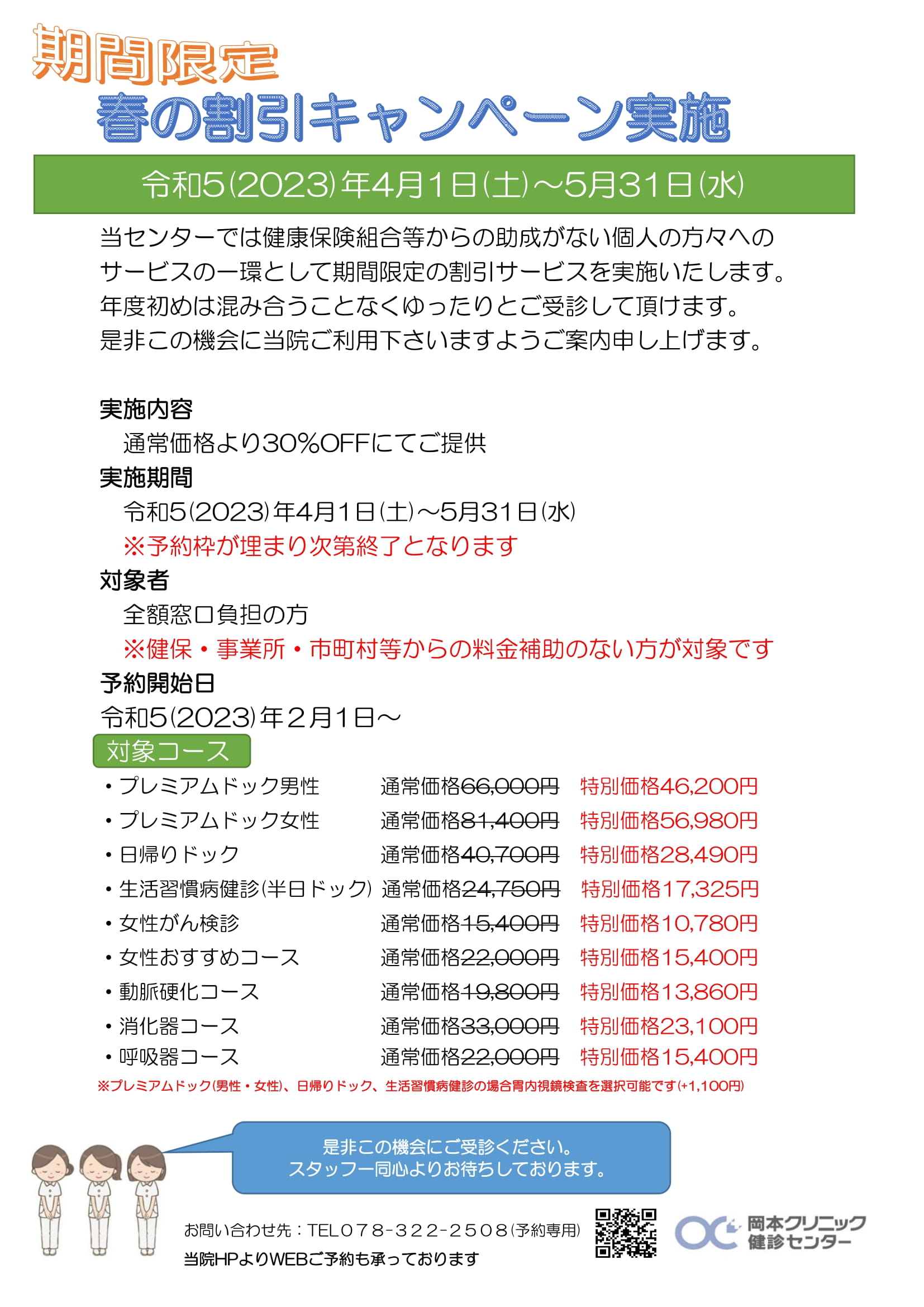 健診オリジナルコース 季節価格のご案内 (2023年4~5月) 2023.1.30 2023年4月~5月受診分の当院オリジナルコース 季節価格にて提供致します。 年度初めは混み合うことなく、ゆったりと受診していただけます。 ぜひこの機会に、当院をご利用ください。 詳しくは ↓ご案内パンフレット↓ を参照ください